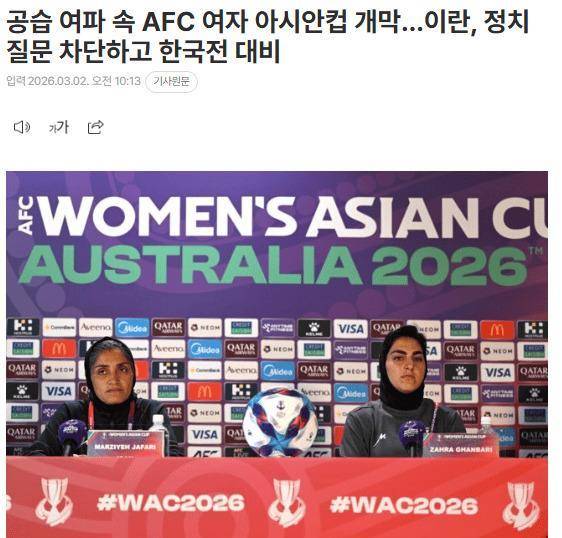 亚足联在赛前发布了一份官方声明。 声明中写道:“亚足联的首要任务,始终是保障所有球员、教练员、赛事官员及球迷的健康、安全与安保。 对此,亚足联正与身处黄金海岸的伊朗女足国家队及相关官员保持密切、常态化沟通,并提供全方位支持与协助。 ”这份声明直接指向了伊朗女足所处的“特殊时期”。