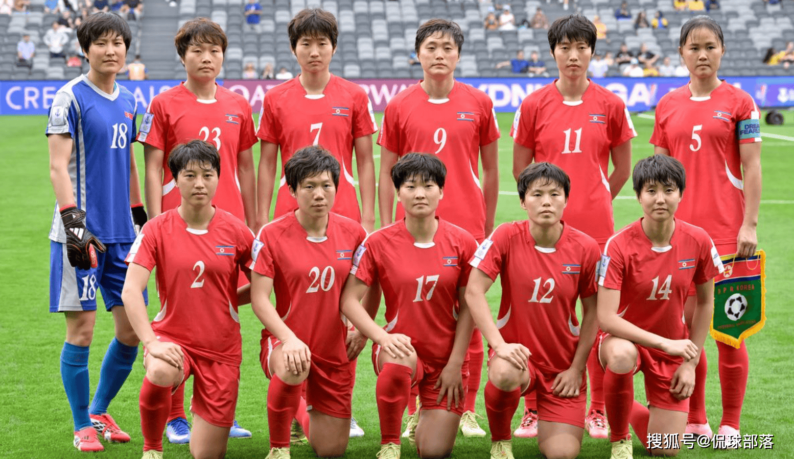 朝鲜女足首发: 18-俞鲜金、2-李明金、23-李慧京、5-安国香、16-宋春心、20-蔡恩勇、9-金成庆、7-明有成、12-洪成玉、11-韩金洪、17-金景英