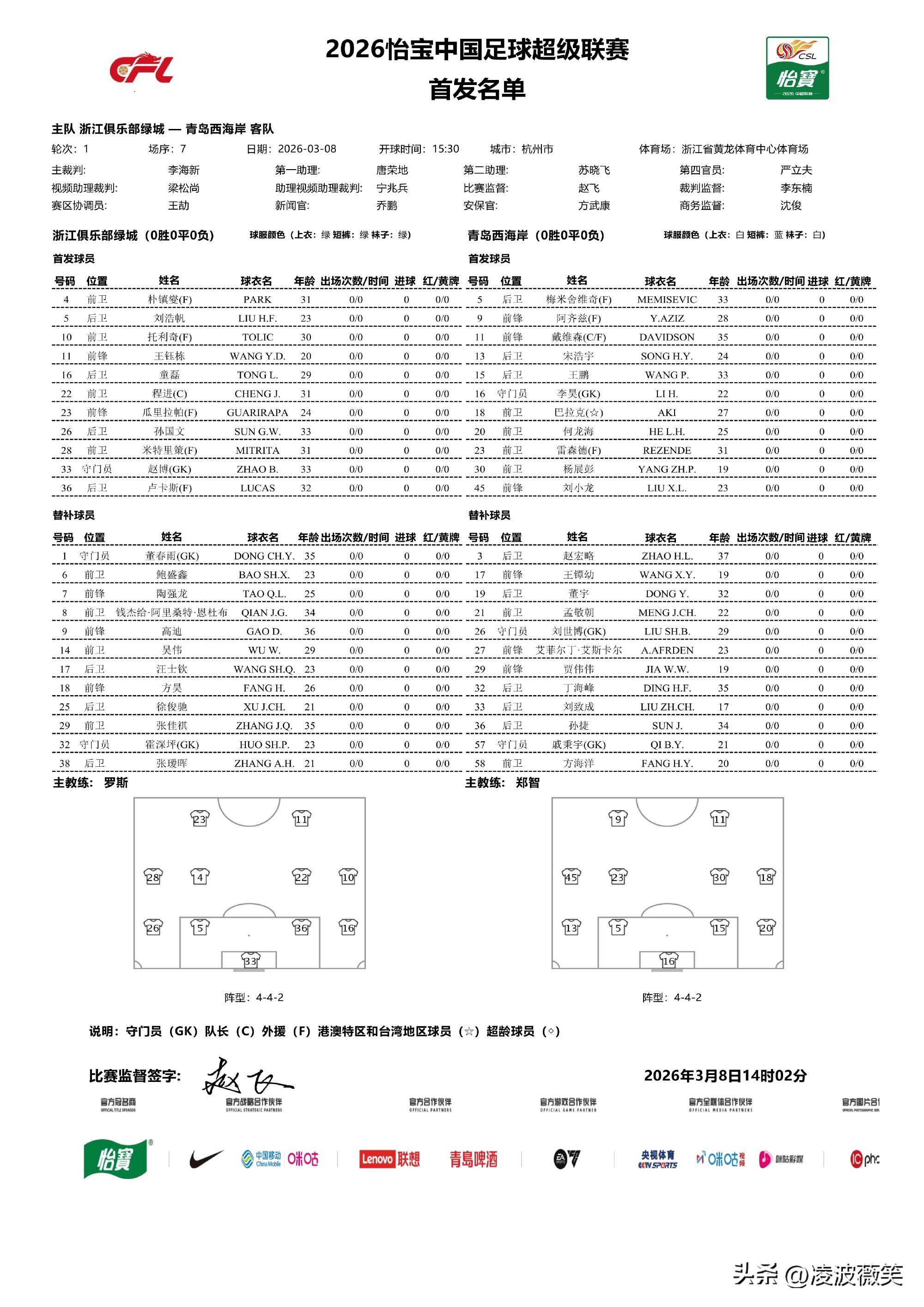 比赛当日是3月8日下午,浙江绿城队主教练罗斯派出了强大的五外援首发阵容,包括瓜里拉帕、卢卡斯、朴镇燮、托利奇以及米特里策。其中,瓜里拉帕、朴镇燮和托利奇更是迎来了他们在中超赛场上的处子秀。队长袖标由程进佩戴,赵博镇守球门。此外,刘浩帆、童磊、孙国文和王钰栋也一同首发出场,为球队注入了活力。而替补席上,董春雨、鲍盛鑫、陶强龙、钱杰给、高迪等球员也随时准备为球队贡献力量。