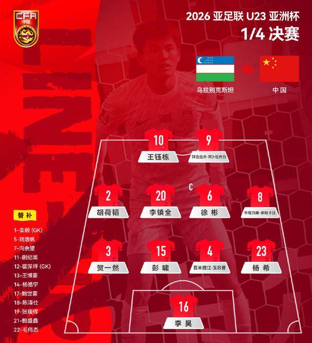 这届赛事前,谁能想到中国U23能以零失球闯入8强,本场首发锋线依旧是王钰栋和拜合拉木-阿卜杜外力,胡荷韬、李镇全、徐彬、木塔力甫-依明卡日,贺一然、彭啸、吾米提江-玉苏普、杨希组成四后卫,门将李昊。