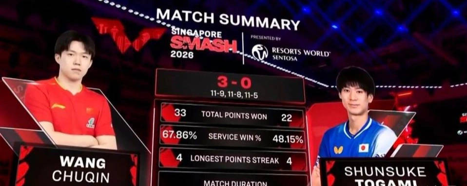此次带着亚洲杯冠军的良好势头,王楚钦在新加坡大满贯首轮亮相即展现统治力。在对阵澳大利亚选手卢伟的32强比赛中,他仅用了22分钟便以3-0速胜。首局比赛,王楚钦凭借犀利攻势以11-2迅速取得领先;第二局尽管对手顽强抵抗,仍以11-9再下一城;进入第三局,卢伟奋力反扑,但王楚钦稳住阵脚,11-8收官,成功晋级。