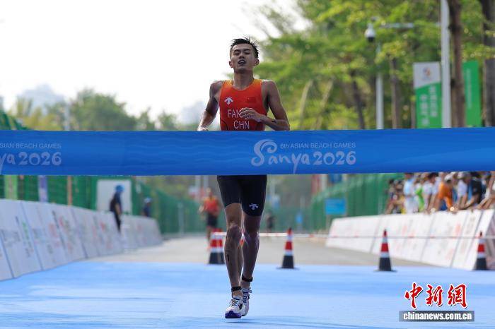 4月23日,第六届亚洲沙滩运动会游跑两项男子个人赛,中国选手范俊杰率先撞线夺得冠军。中新网记者 骆云飞 摄