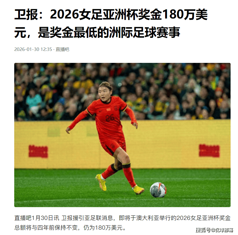 今年2月初,《卫报》援引亚足联的消息,2026女足亚洲杯的奖金总额与四年前保持不变,仍为180万美元,远不如2025年女足欧洲杯的4720万美元、2024年女足非洲杯的347.5万美元。