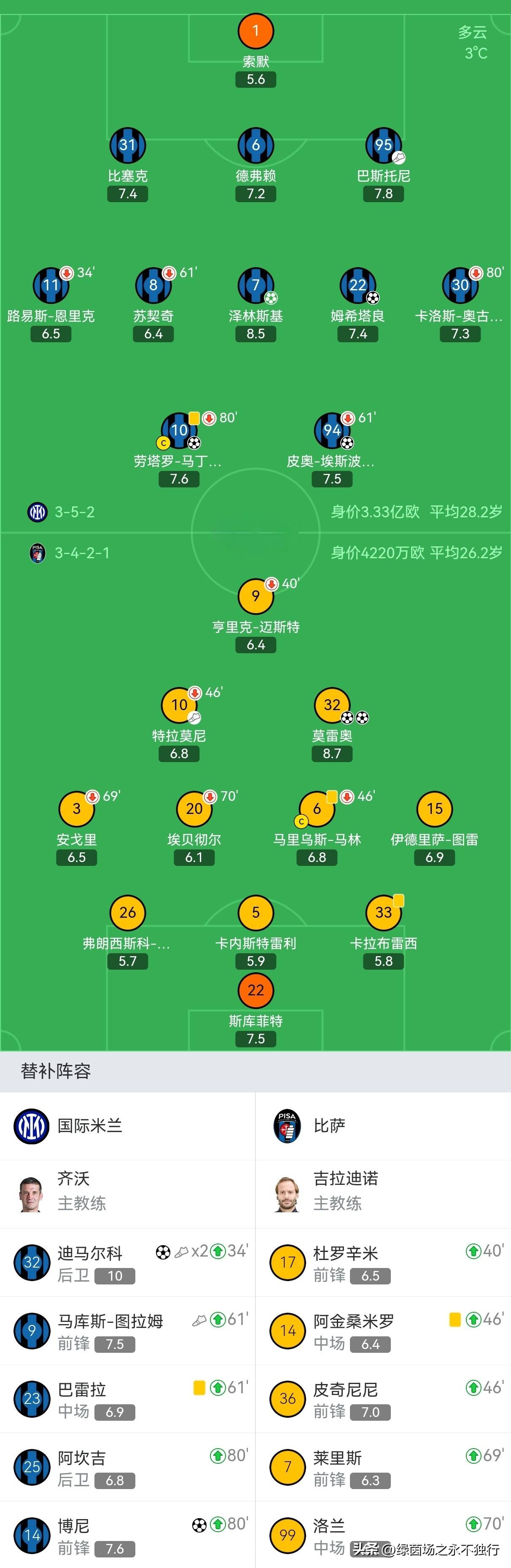 不过回到意甲联赛中,本场面对垫底的比萨队,国米派出了绝大多数主力阵容,在主场大胜对手。
